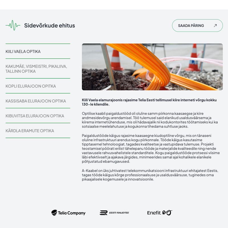Valmis on saanud uus ja võimas A-Kaabel koduleht, mis peegeldab nende missiooni pakkuda jätkusuutlikke ja tulevikukindlaid tehnosüsteemide terviklahendusi. Meie fookus oli luua veebileht, mis edastaks usaldusväärsust ja tehnilisi aspekte juba esimesel pilgul. Kodulehe ülesehitus on strateegiliselt optimeeritud, et tutvustada A-Kaabli teenuseid selgelt ja loogiliselt. Disainis kasutasime puhtaid jooni ja professionaalset tooni, rõhutades ettevõtte kvaliteedi pühendumust.