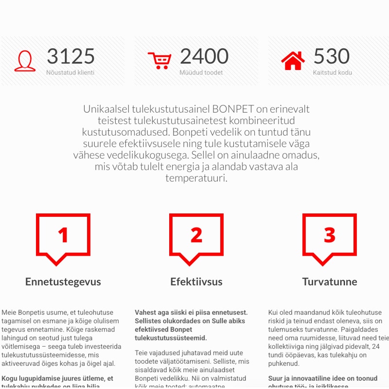 Meie meeskond tegi BONPET’le uue kodulehe, mis esitleb nende tulekustutussüsteeme kui parimat viisi elude ja vara kaitsmiseks. Turvalisuse valdkonnas on usaldus ja informatiivsus kriitilise tähtsusega, mistõttu keskendusime detailsusele ja selgele tooteesitlusele. Koduleht tutvustab Bonpeti innovaatilisi lahendusi ja nende eeliseid traditsiooniliste meetodite ees. Lõime professionaalse ja tõsise tooni, mis edastab usaldusväärsust ja ohutusmõtlemist. Uus platvorm on nüüd keskne infopunkt, mis toetab Bonpeti müüki ja turundust, aidates neil pakkuda meelerahu klientidele üle Eesti.